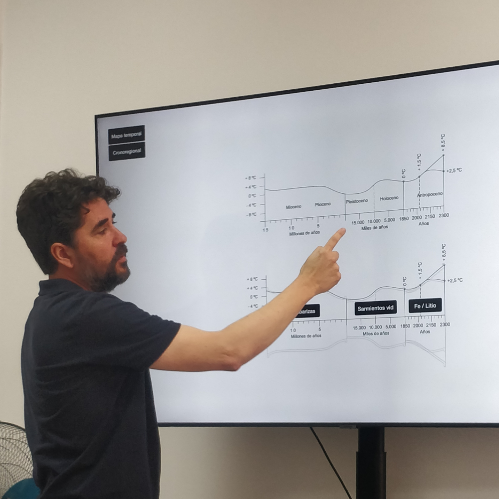 Divido en tres periodos geológicos, el objetivo era representar con esmaltes los materiales que compusieron los paisajes originarios de la campiña de Jerez: la albariza, vinculada al Mioceno; la vid de la época del Holoceno y diferentes metales como el hierro o el litio relacionados con el Antropoceno.